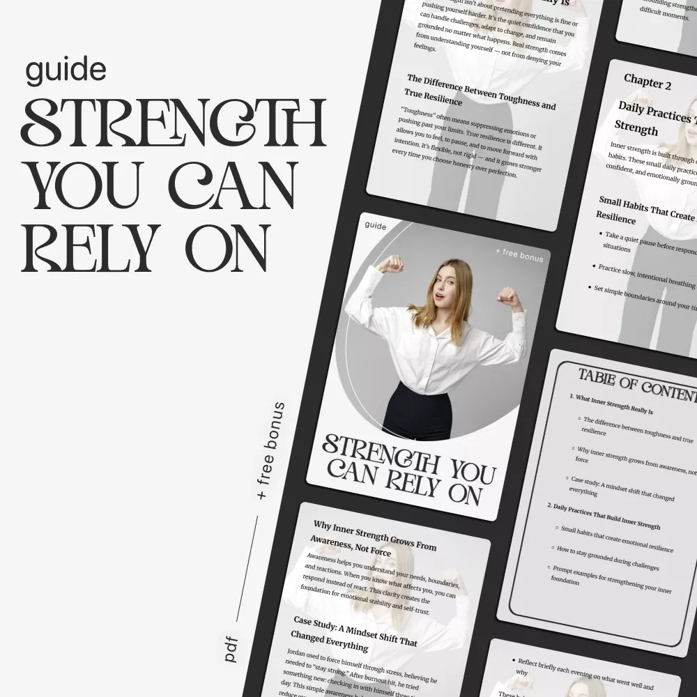 Strength You Can Rely On is a digital guide that helps you understand, nurture, and grow your inner resilience in a grounded, sustainable way. Instead of pushing yourself harder, this guide shows you how to build inner strength through self-awareness, reflection, and gentle consistency. Perfect for anyone who wants to feel more capable, calm, and centered — even when life feels uncertain — it gives you practical tools to strengthen your emotional foundation and restore confidence in your own stability.