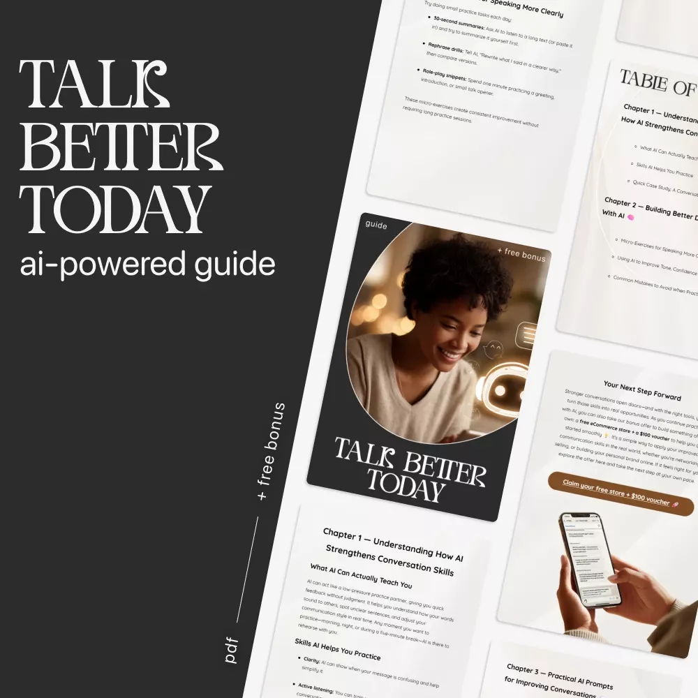 Unlock more confident, natural, and engaging conversations with Talk Better Today, your step-by-step digital guide on how to use ai to improve conversation skills. Designed for anyone who wants to speak more clearly, connect more easily, and communicate with confidence, this downloadable resource shows you exactly how to use AI tools to build real-world speaking habits—without overwhelm or guesswork.